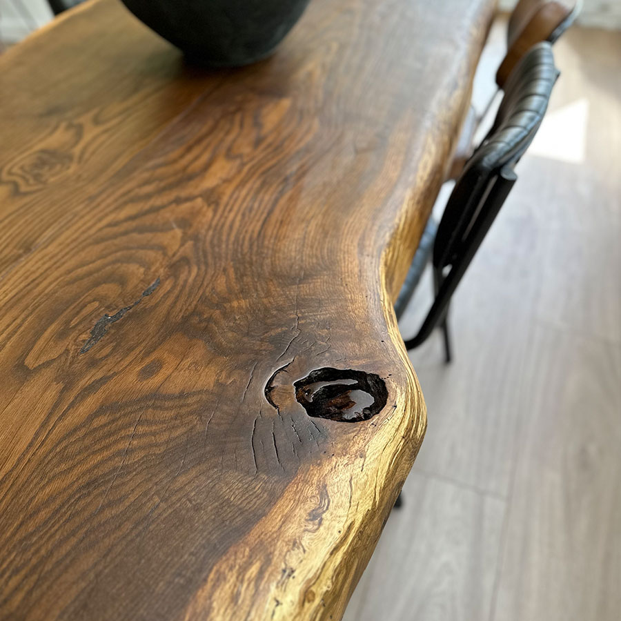 Die aneinanderliegenden Bohlen mit aufgearbeiteter Baumkante und schwarzem Stahlgestell werden zum Blickfang jedes Ess- und Wohnzimmerbereichs. Mit natürlichem Ast- und Splintholzanteil. Die Äste wurden nicht verfüllt, was jeden Esszimmertisch optisch zu einem Unikat werden lässt. Die massive Eichen-Platte wurde zum Schutz geölt und hebt die spannungsreiche Holz-Maserung in den Vordergrund.