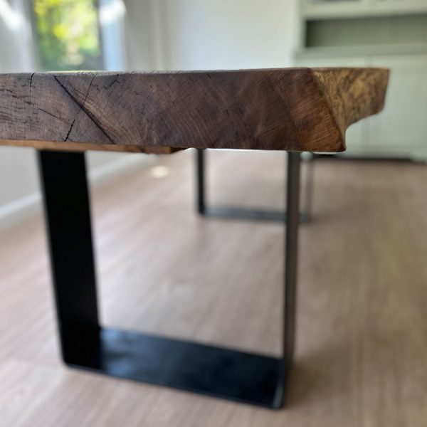 Die aneinanderliegenden Bohlen mit aufgearbeiteter Baumkante und schwarzem Stahlgestell werden zum Blickfang jedes Ess- und Wohnzimmerbereichs. Mit natürlichem Ast- und Splintholzanteil. Die Äste wurden nicht verfüllt, was jeden Esszimmertisch optisch zu einem Unikat werden lässt. Die massive Eichen-Platte wurde zum Schutz geölt und hebt die spannungsreiche Holz-Maserung in den Vordergrund.