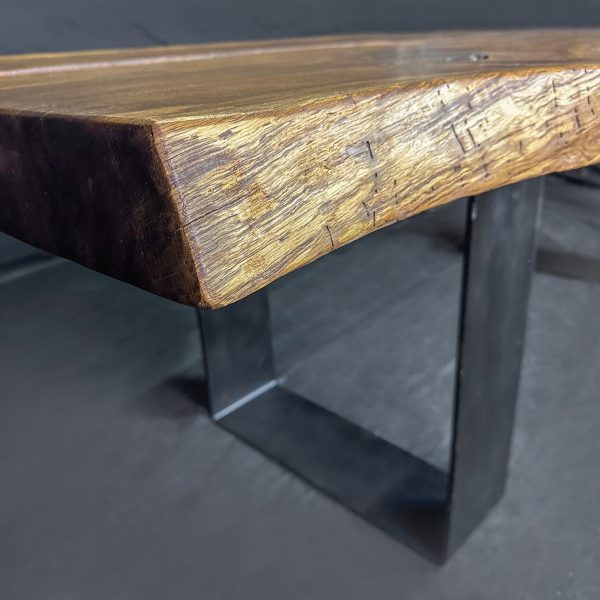 Die aneinanderliegenden Bohlen mit aufgearbeiteter Baumkante und schwarzem Stahlgestell werden zum Blickfang jedes Ess- und Wohnzimmerbereichs.