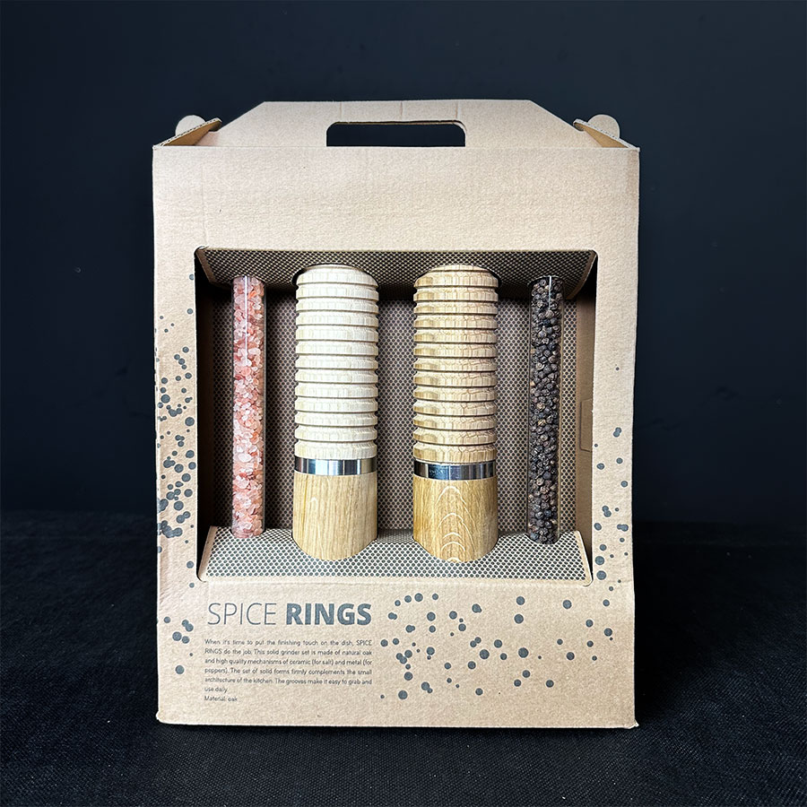 Die Gewürzmühlen sind aus FSC-zertifiziertem Eichenholz gefertigt und mit einem hochwertigen Mahlwerk ausgestattet: das Mahlwerk der Salzmühle besteht aus Keramik, das Mahlwerk der Pfeffermühle aus Metall. Um einer Verwechslung der Mühlen entgegen zu wirken, sind die Mühlen wahlweise mit “Salt” oder “Pepper” beschriftet. Darüber hinaus umfasst das Set ein passendes Holztablett, das der Salz- und der Pfeffermühle eine sichere und stilvolle Ablage bietet und bei Bedarf deren Transport erleichtert.